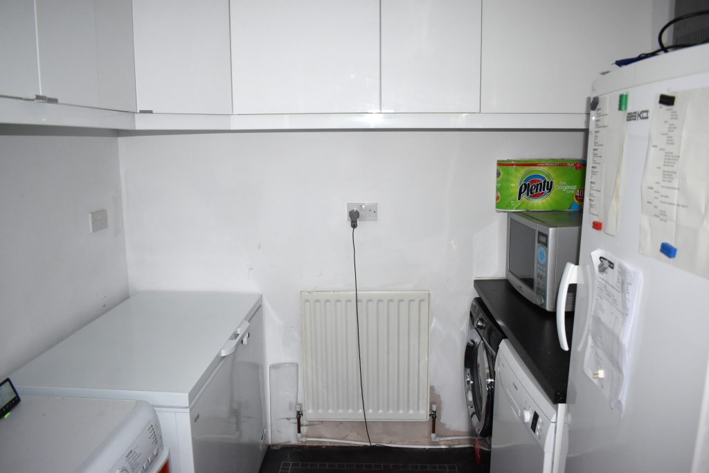 Fitted with wall units in white gloss to complement those in the kitchen, there is space for a chest freezer, fridge freezer, tumble drier and space and plumbing for a washing machine.