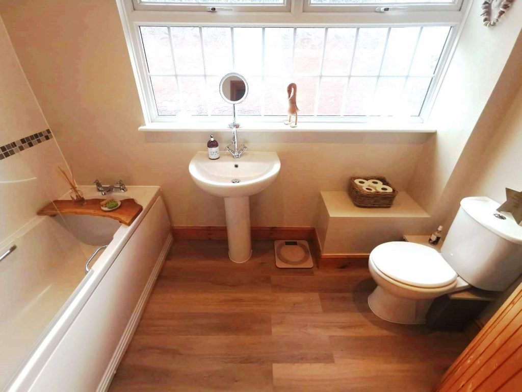 A spacious family bathroom with three-piece white suite comprising closed coupled W.C, pedestal wash hand basin and panelled bath with glazed shower screen and Mira shower over. There is a large UPVC double glazed opaque window to the side, partial wall tiling, ceiling spotlights and the benefit of a chrome heated towel rail.