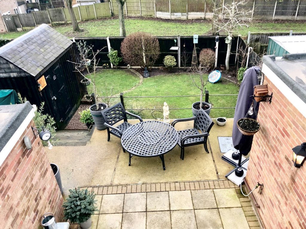 The rear garden doesn’t disappoint either with a raised patio area ideal for outside dining and a nice sized lawn with stocked borders.