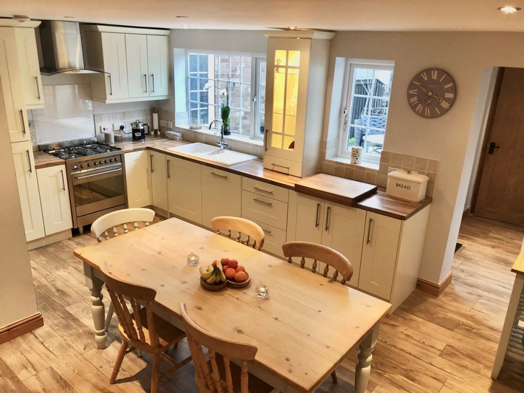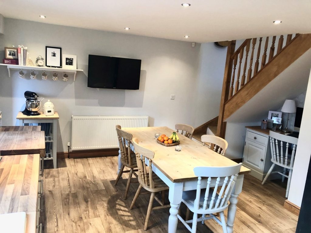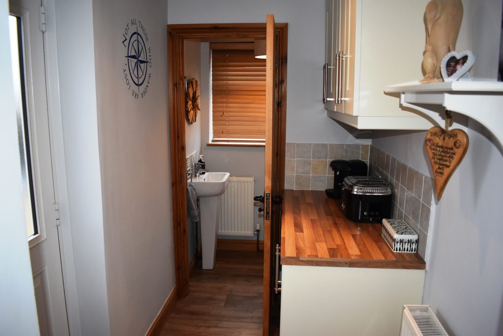 The kitchen area is the central hub of this house having been fitted with a wealth of attractive wall and base units offering ample storage but also plenty of room for a large dining table. There is even space under the stairs for a workstation or perhaps a cosy reading nook. The cream units are complemented by the wooden butcher’s block style work surfaces and oak effect flooring, there is a coordinated tiled splash back, ceiling spotlights, thermostatically controlled radiator and a wall mounted television point. The fitted kitchen incorporates an integrated fridge freezer, integrated dishwasher, sink with chrome filtered water tap and space for freestanding oven with extractor over. There are two UPVC double glazed windows to the rear and the kitchen gives access to the utility room as well as stairs leading to the first floor.