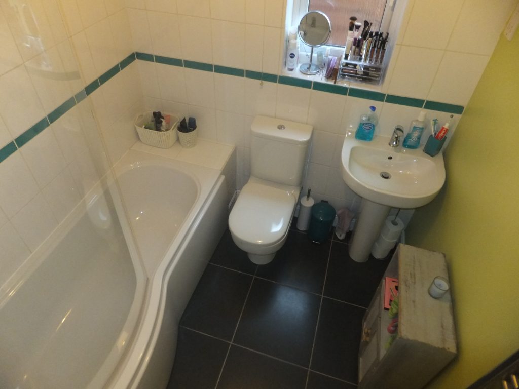 With part wall tiling, floor tiling, UPVC double glazed window to the side, closed coupled W.C, pedestal wash hand basin, sculptured bath, shower screen, electric shower over, chrome towel rail radiator and ceiling light point.