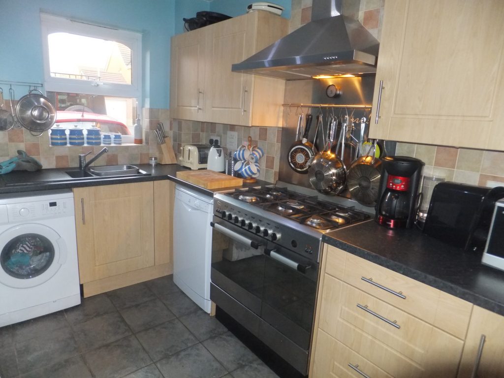 With a range of wall and base units with roll top works surfaces, five ring range style oven, space and plumbing for washing machine, space and plumbing for dish washer, space for fridge freezer, thermostatically controlled radiator, tiled floor, power points, ceiling spot lights and UPVC double glazed window to the front.