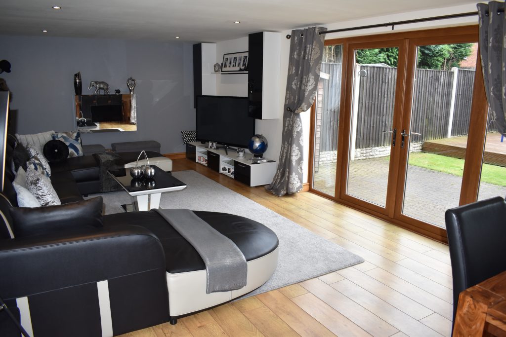 With wall mounted fire, power points, TV aerial point, ceiling spotlights and double-glazed patio doors with full length windows to either side which overlook and open onto the garden.