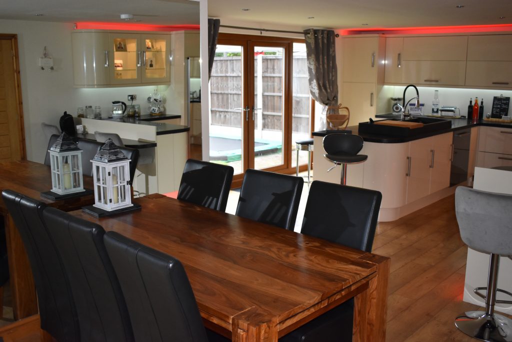 The main hub of the house is an open plan space which occupies the full width of the property and comprises a stunning comprehensively fitted bespoke kitchen having all the expected appliances and finished to an high standard, with numerous power points, double-glazed patio doors with full length windows to either side, ceiling spot lights, plinth and ceiling mood lighting. Access to Utility room.