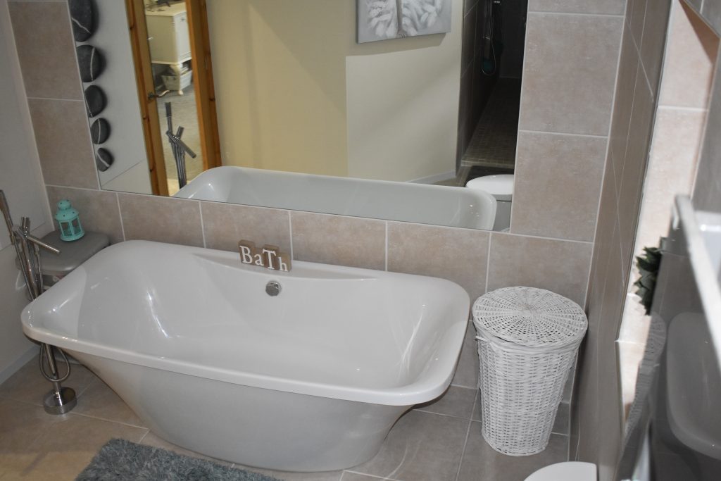 With a four piece suite comprising multi-jet shower, wash hand basin, closed coupled W.C, bath, wall tiling, floor tiling, double glazed opaque window to the side, ceiling spot lights and extractor.