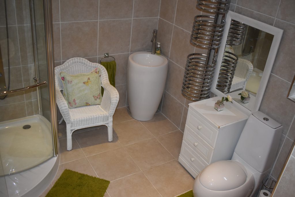 With three-piece suite with shower, closed coupled W.C, wash hand basin, chrome towel rail radiator, extractor and ceiling spot lights.