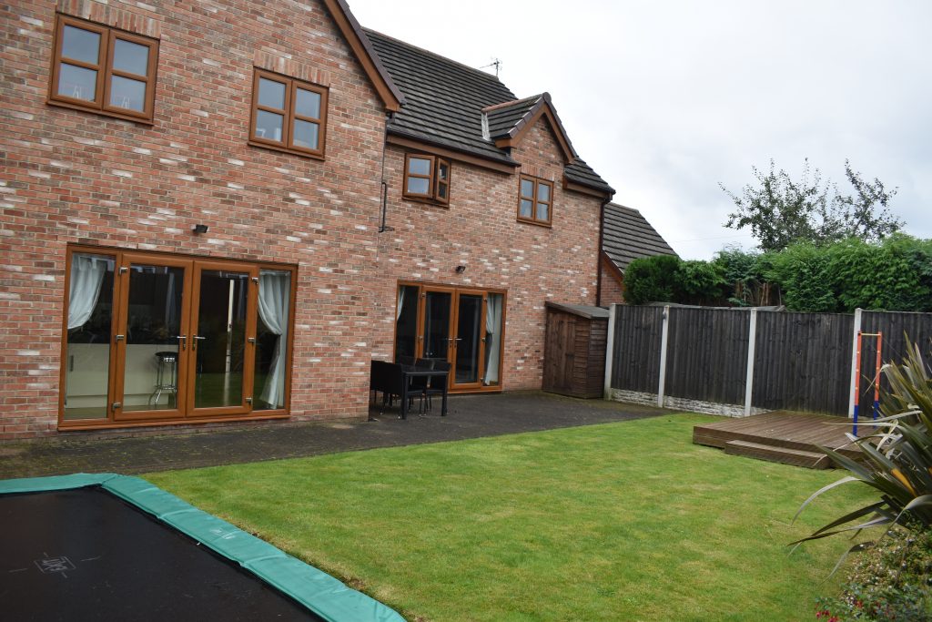 Enclosed rear garden with patio area, decked area and the remainder laid to lawn with well stocked borders. The double garage with wooden barn style door, power and ceiling light points. The garage is large enough to take two executive size cars.