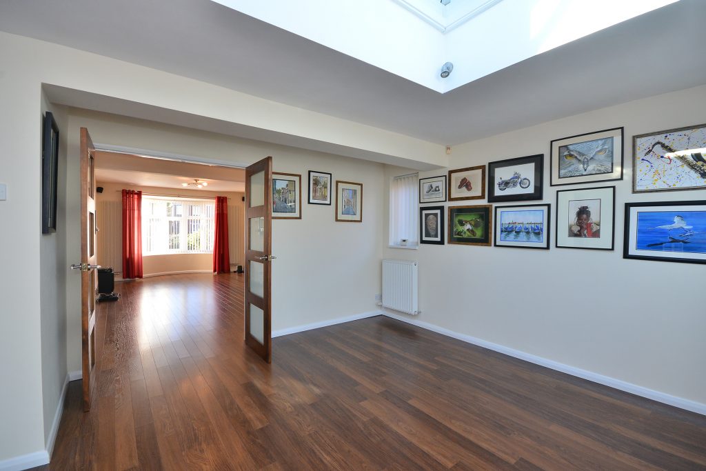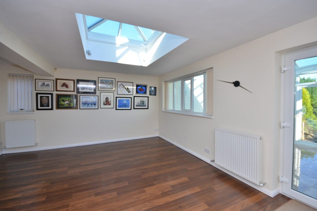With two double glazed windows, a lantern roof which allows ample natural light into this area, as well as being an attractive design feature with dimmable lighting, two radiators, oak laminate flooring and French doors leading to the conservatory.