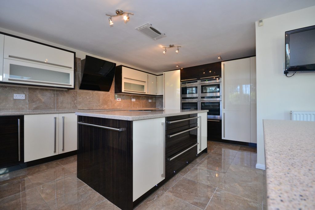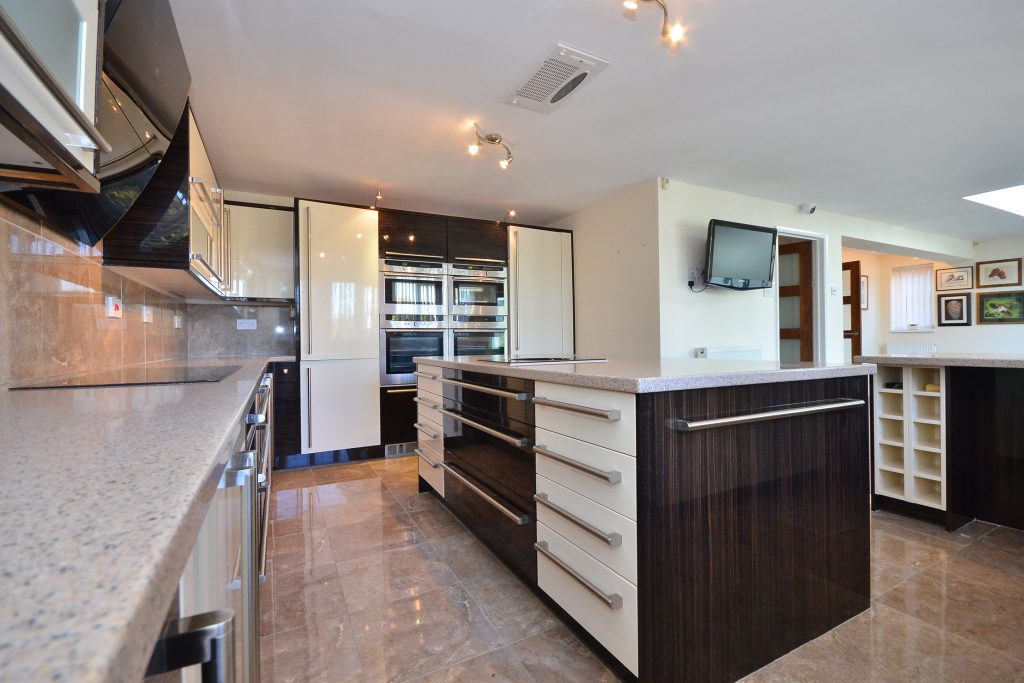 The kitchen has a range of wall and base units with fitted worksurfaces and moulded inset sinks and drainer, integrated dishwasher, integrated washing machine, breakfast bar, large induction hob and an highly unusual but very useful induction wok burner, sleek hideaway extractor fan, two integrated ovens, integrated combination microwave, integrated steamer oven, integrated full height fridge freezer, a separate full height integrated freezer, a radiator, remote control kick-space heater for that extra boost of warmth at short notice, a work island, feature lighting and kick plinth lighting on the island. There is tiled flooring with under-floor heating, two double glazed windows, generously equipped with electric power points, included in the island. A TV point and a swivel TV mount that allows viewing TV whether preparing food on the island or enjoying it in the dining area. Last but not least the all essential two sets of wine racks.