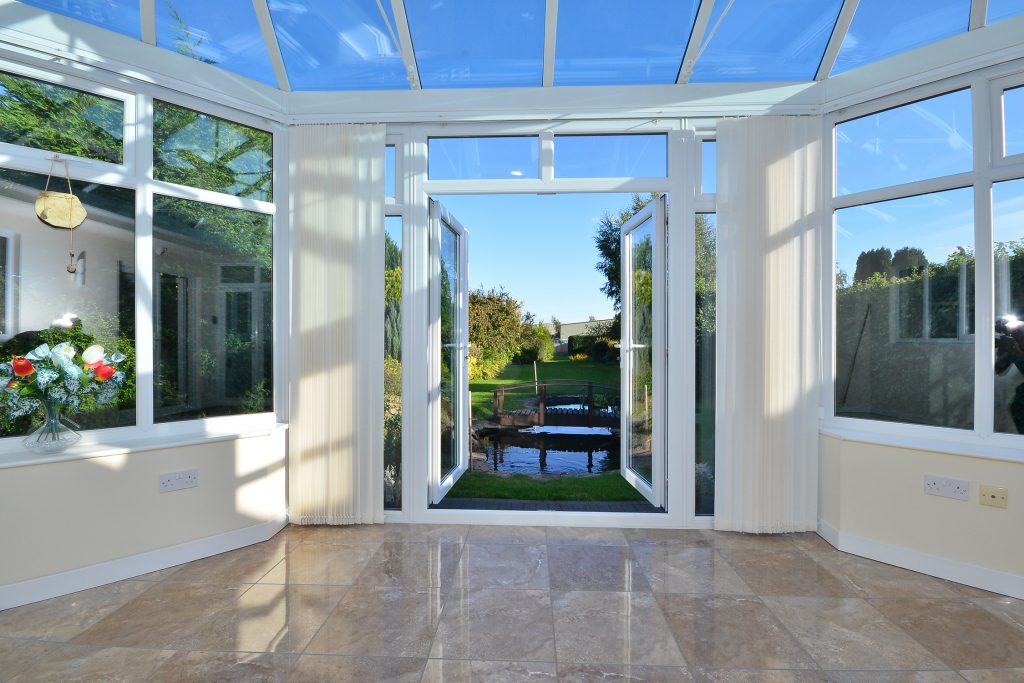The conservatory has double glazed windows with unrestricted vision over the large garden including delightful views beyond, two sets of French doors, blue glass roof, tiled flooring with under-floor heating, TV point, large remote-control fan and suspended ceiling light.