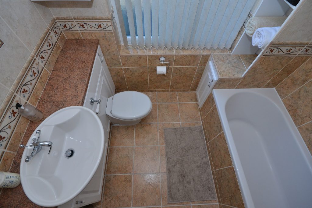 With bath with shower over, low flush WC, wash hand basin with storage, chrome heated towel rail, tiled walls, a double glazed opaque window and tiled floor with under-floor heating.
