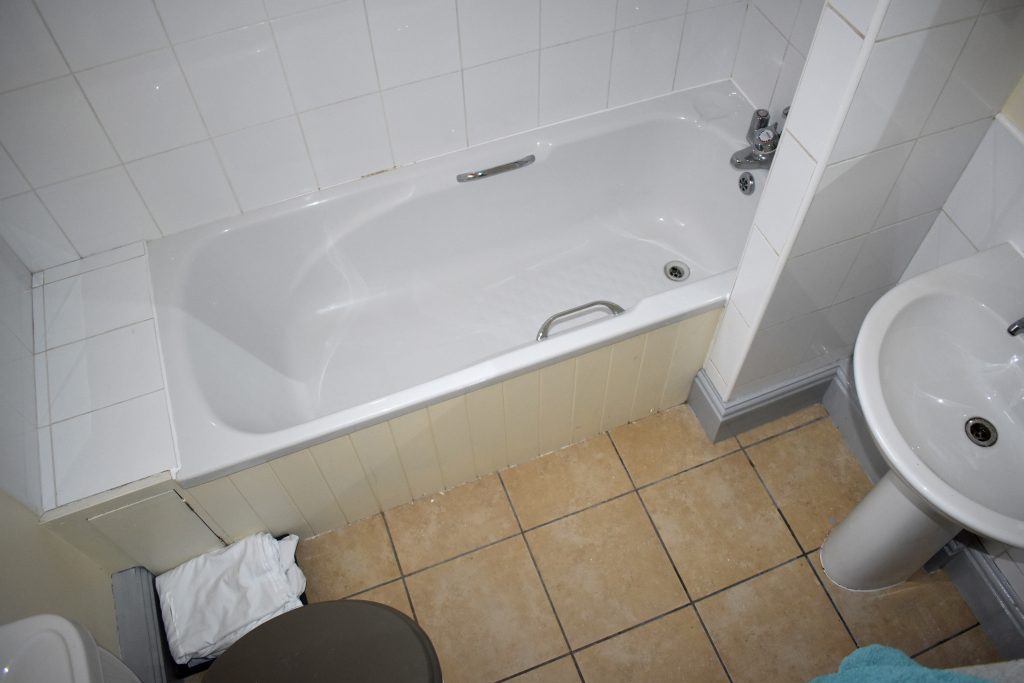 The bathroom is fitted with a three-piece white suite comprising a panelled bath, pedestal wash hand basin and close coupled W.C.. With tiled flooring, part tiled walls, radiator and ceiling light point.