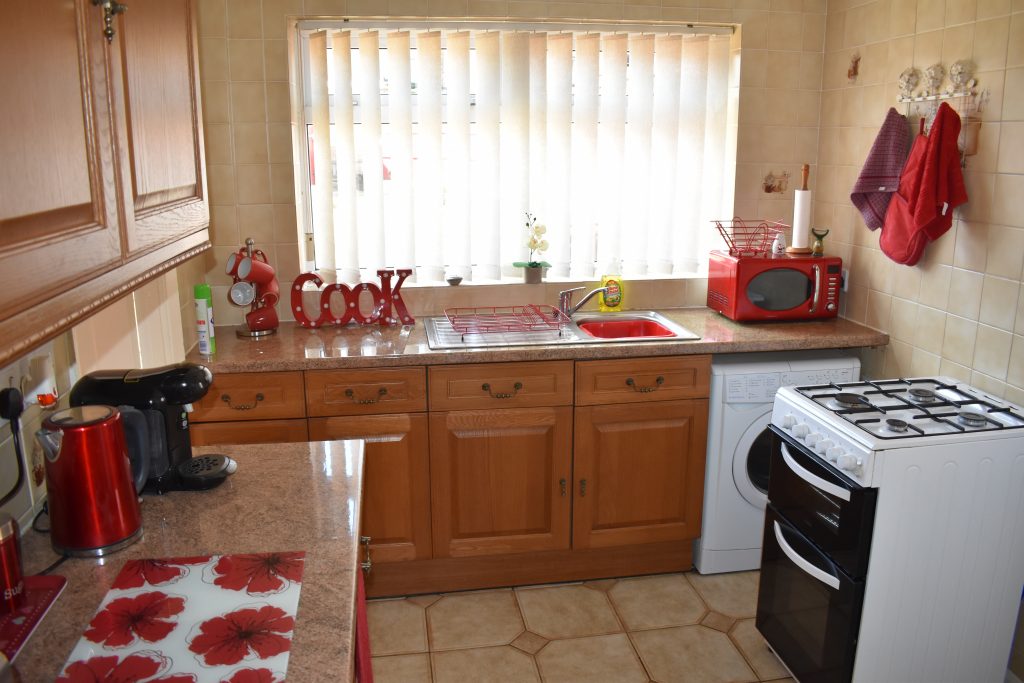 With window to the rear, wall and base units, space and plumbing for washing machine, stainless steel sink, wall tiling and floor tiling.
