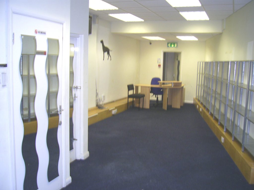 42’ x 13’ maximum narrowing to 8’ 6”. With glazed front entrance door and two large display windows, suspended ceiling with lighting and spot lighting, fitted shelving, numerous power points and telephone point. Door to stairs to first floor landing.